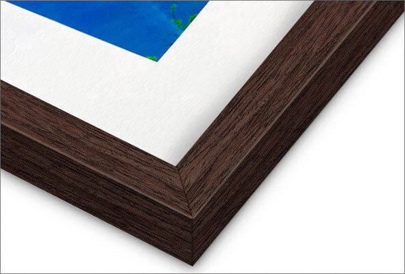 We use solid wood frames with optical-grade clear acrylic. The backing is kraft paper dust cover with hanging wire included.